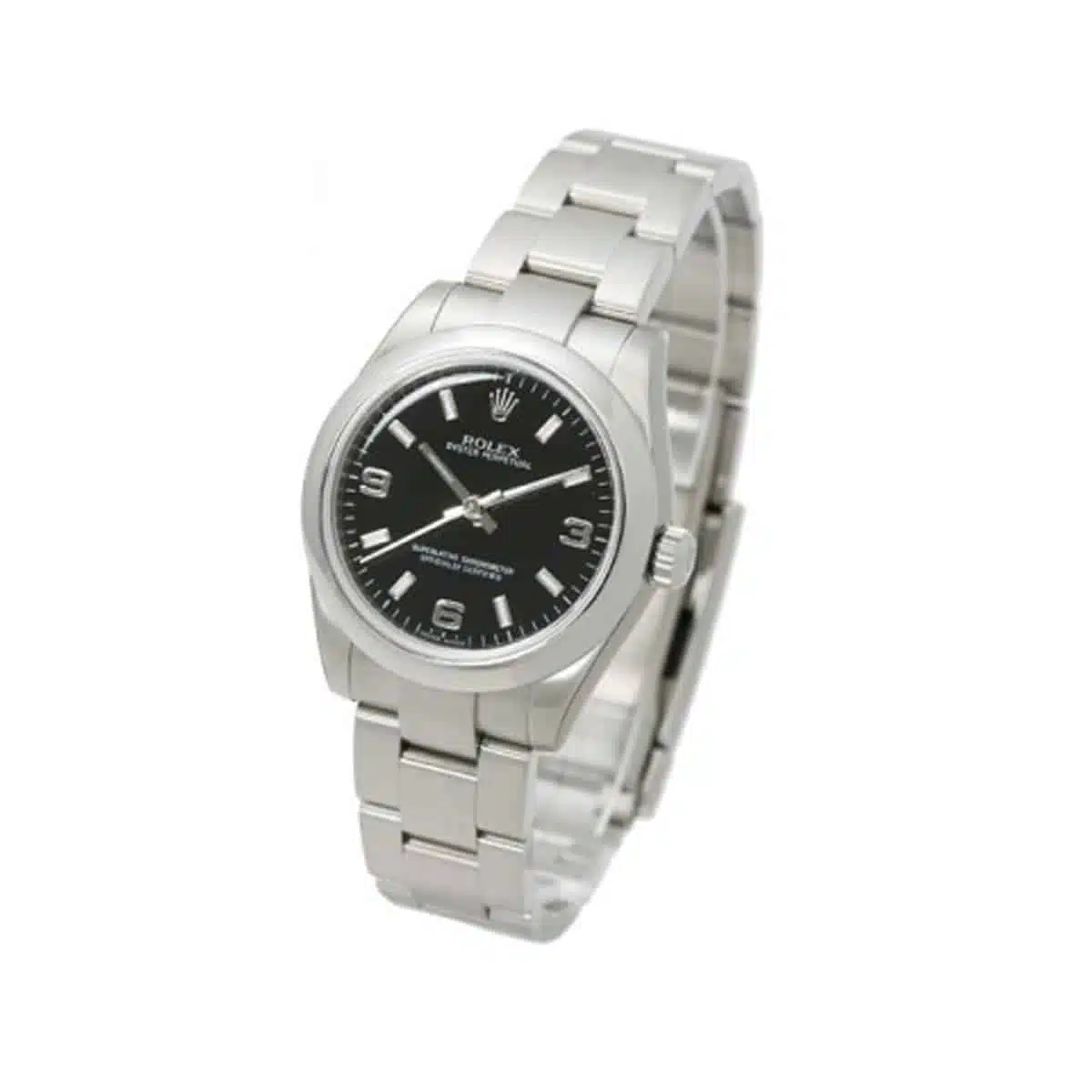 The Rolex Oyster Perpetual 31 (ref. 177200-6) features an automatic movement; black with luminescent markers arabic numerals dial; sapphire-crystal, transparent case back; and 31 mm, polished steel case on a polished steel strap with a polished steel oyster folding clasp.