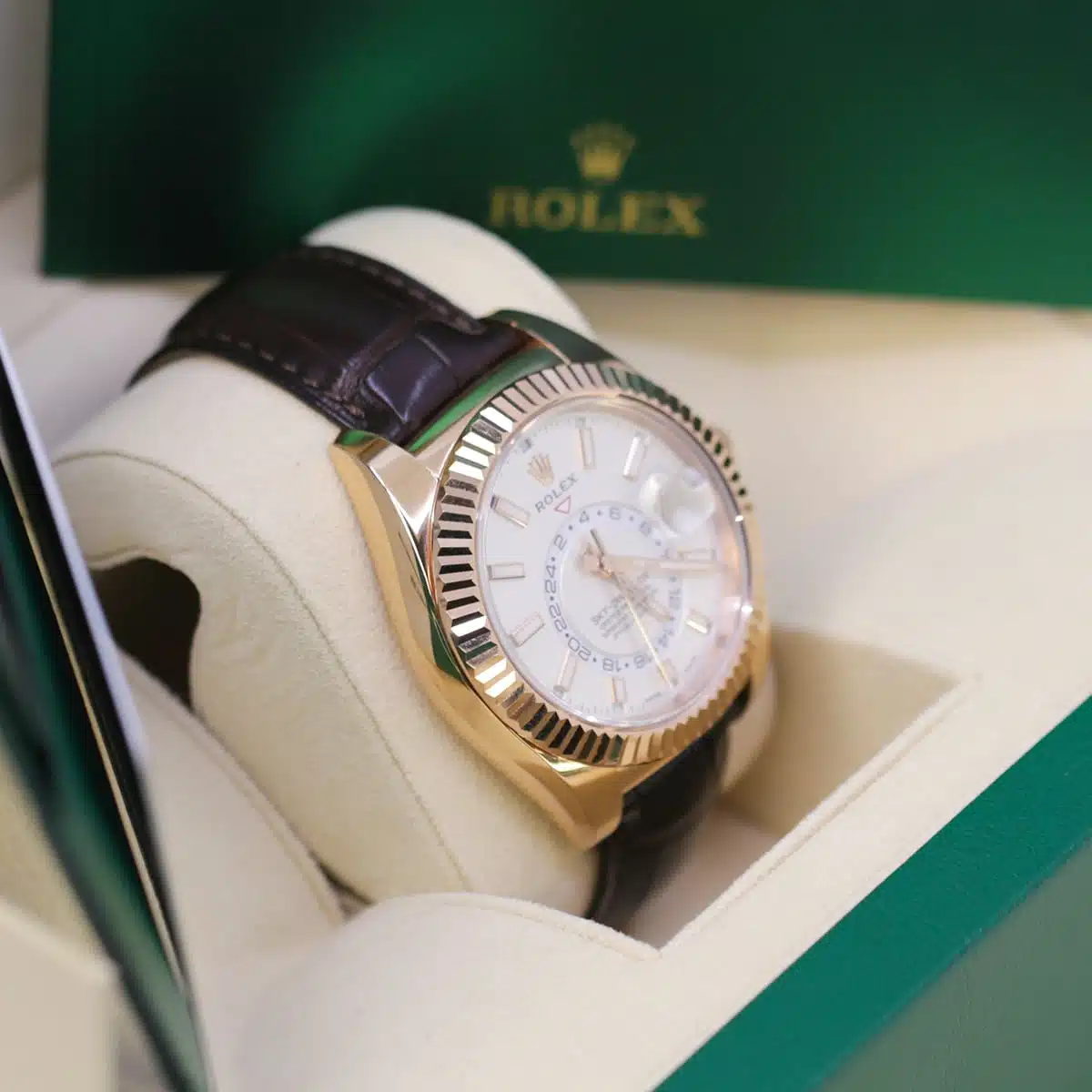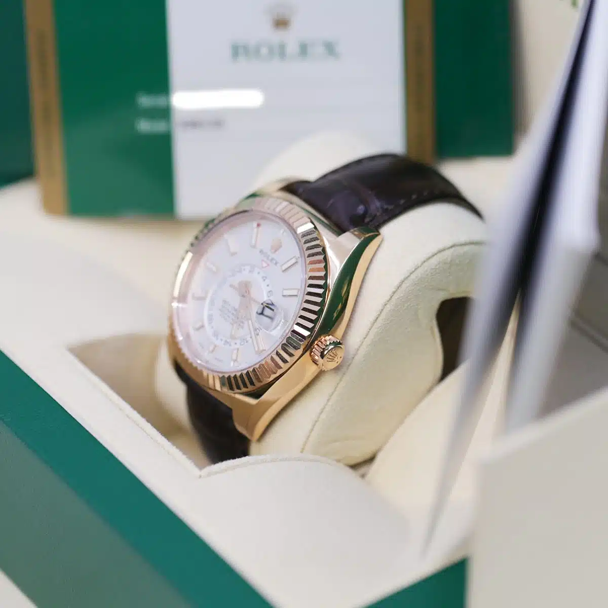Rolex calibre 9001 automatic movement with a 72-hour power, second time-zone displayed via off-center rotating disc, Saros annual calendar with date at 3 o’clock and month indicated in discrete apertures at each of the 12 hour marks, brown leather strap, folding Oysterclasp buckle. Waterproof to 100 meters / 330 feet.