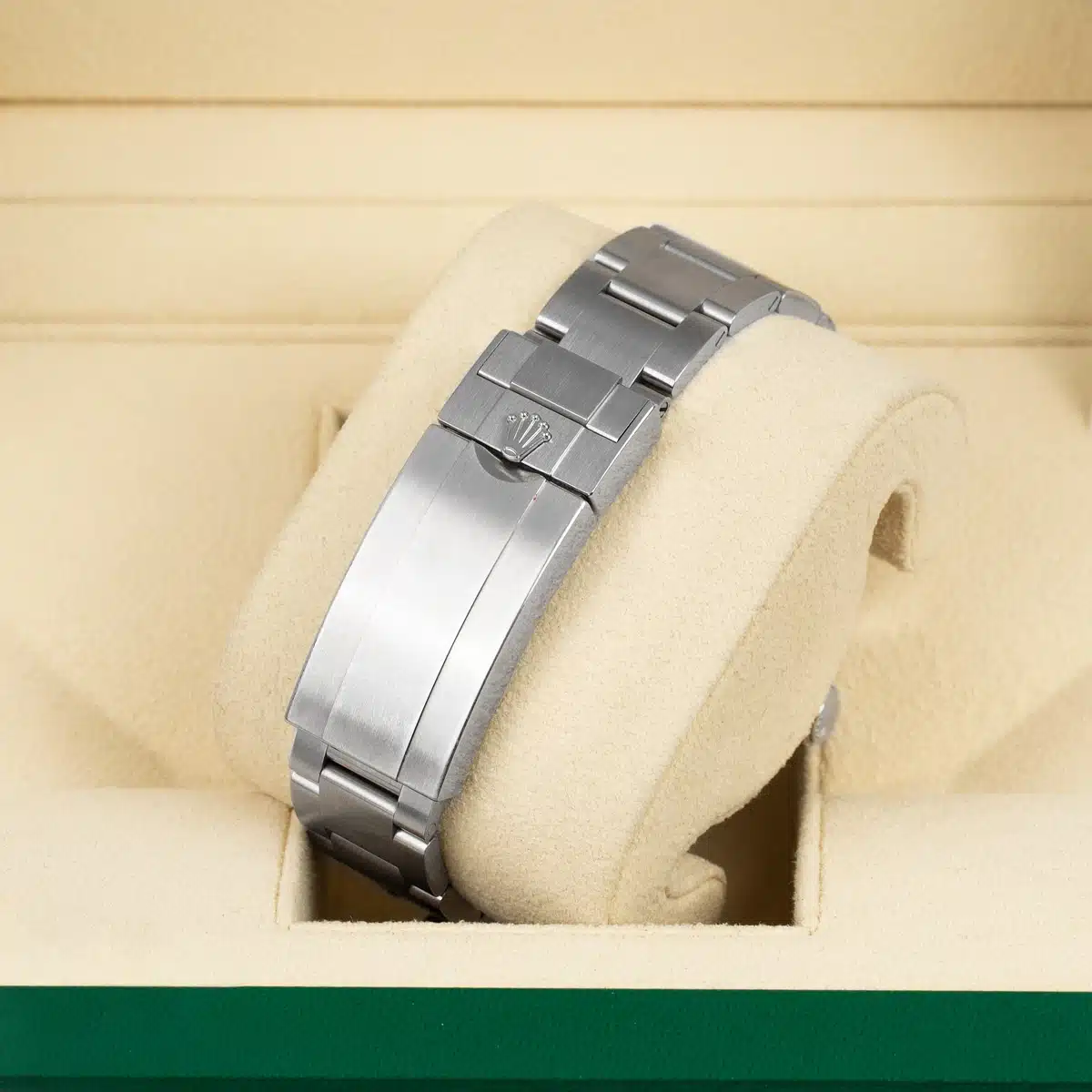 Rolex calibre 3235 automatic movement, approximately 70 hours of power reserve, Oyster bracelet with flat three-piece links, folding Oysterlock buckle with glidelock extension system. Waterproof to 300 meters.