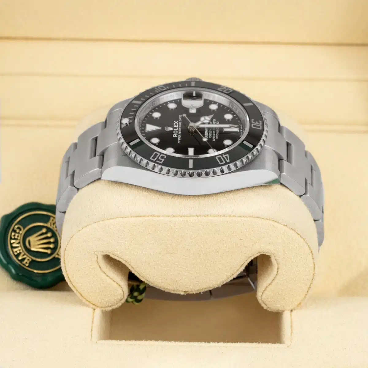 41 mm Oystersteel case, screw-down crown with triplock triple waterproofness system, unidirectional rotatable bezel with Cerachrom insert and platinum coated numerals and graduations, scratch-resistant sapphire crystal with cyclops lens over the date, black dial.