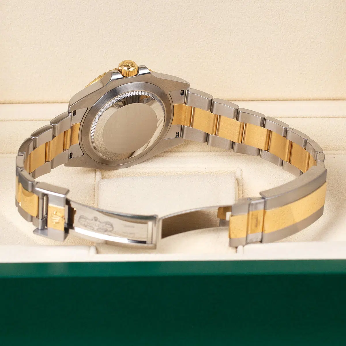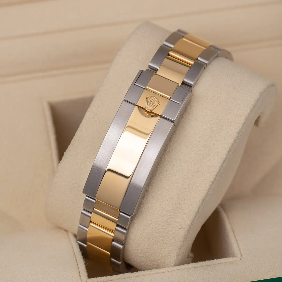 41 mm yellow Rolesor case comprised of Oystersteel and 18K yellow gold, screw-down crown with triplock triple waterproofness system, unidirectional rotatable 18K yellow gold bezel with blue Cerachrom insert and gold coated numerals and graduations, scratch-resistant sapphire crystal with cyclops lens over the date. Blue dial, Rolex calibre 3235 automatic movement, approximately 70 hours of power reserve, yellow Rolesor Oyster bracelet with flat three-piece links, folding Oysterlock buckle with glidelock extension system. Waterproof to 300 meters.