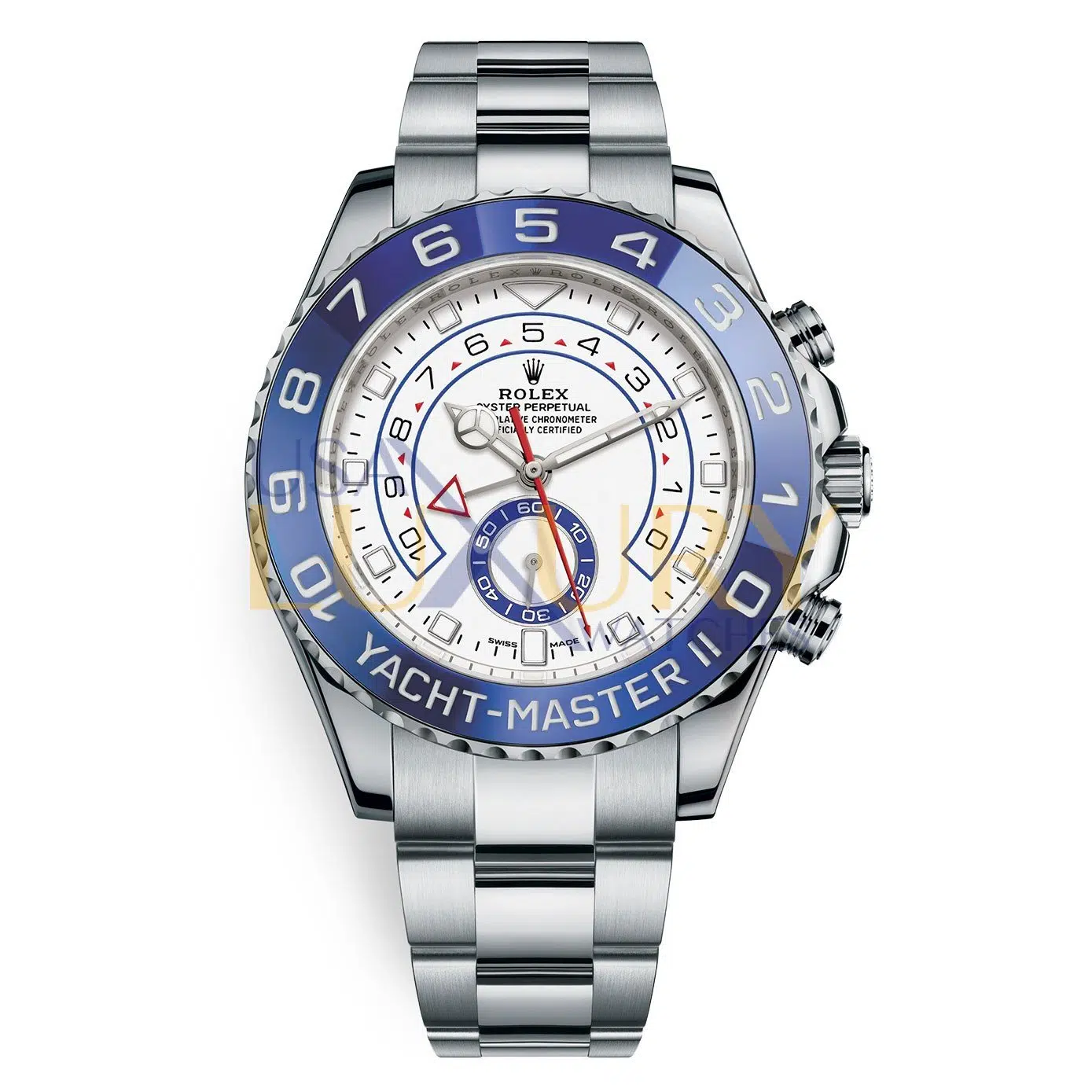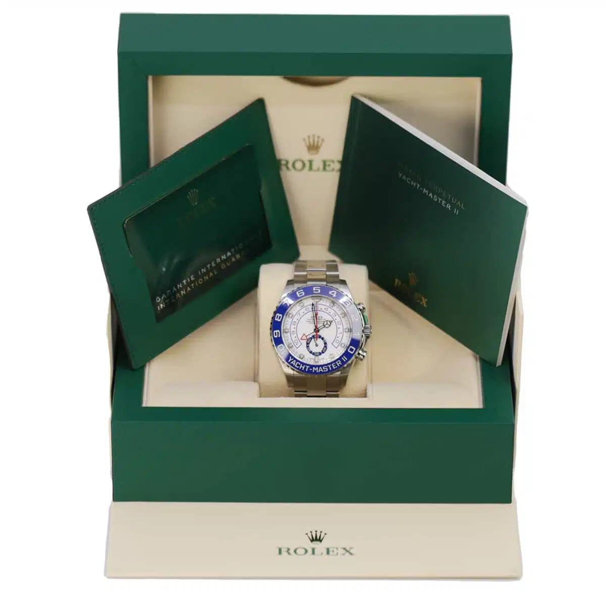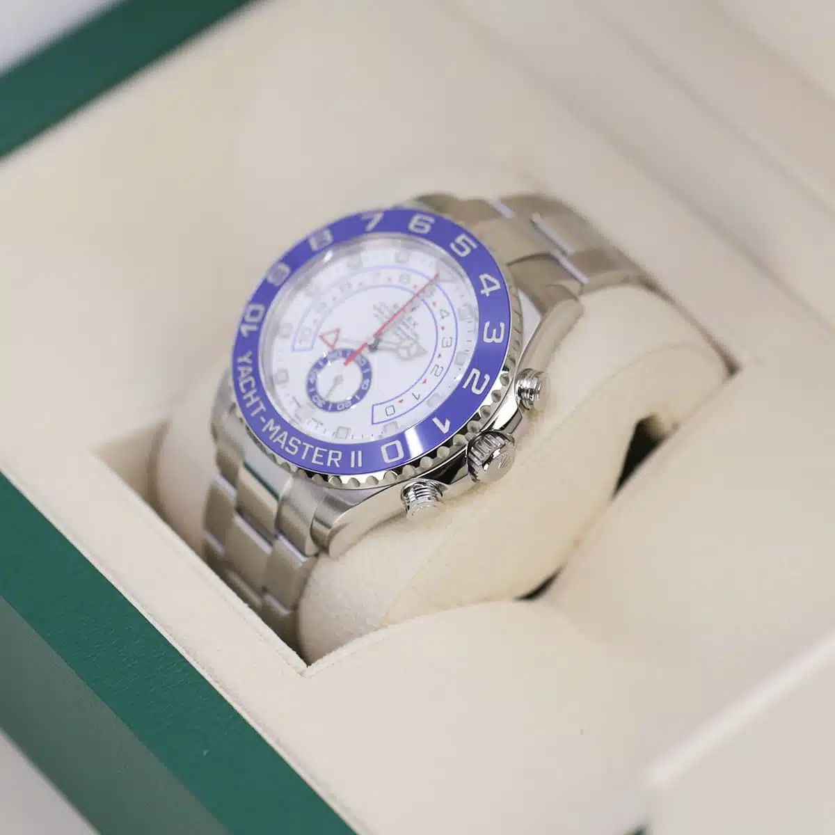 Rolex Yacht-Master II 44 Watch White Dial. 44mm stainless steel case, 90 degree rotatable Command bezel with blue Cerachrom insert, matt white dial with blue lacquer small seconds counter, automatic movement with programmable countdown function, stainless steel bracelet with Oysterlock safety clasp and 5 mm comfort extension link.