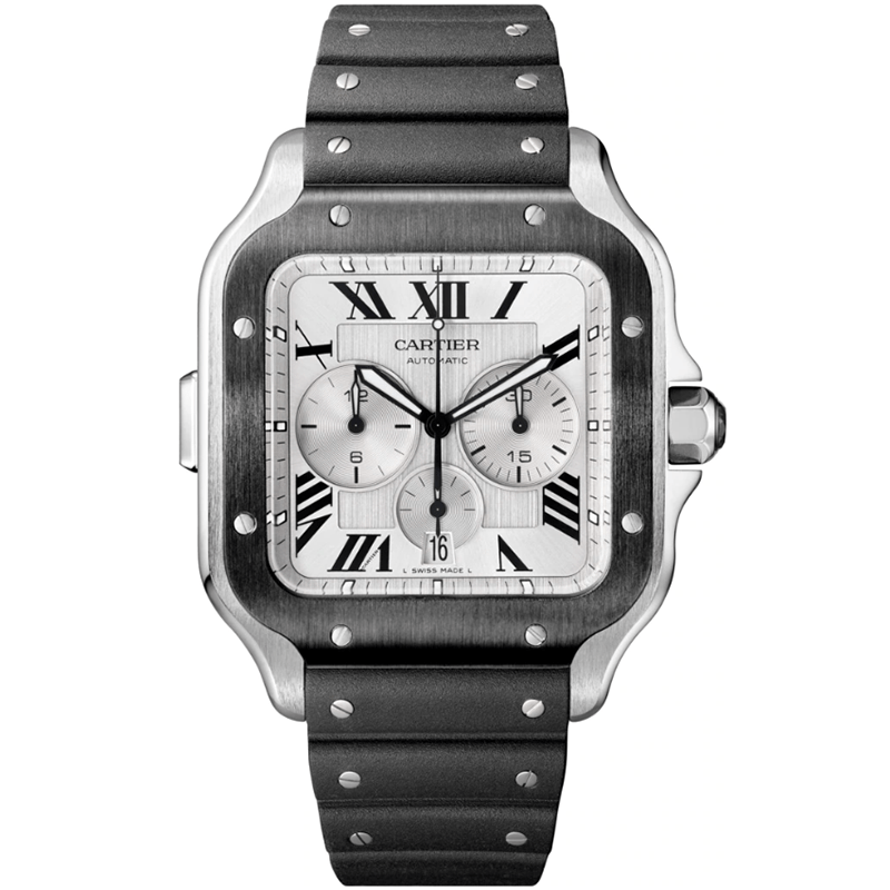Santos watch, extra-large model, chronograph mechanical movement with automatic winding, caliber 1904 CH MC. Steel case, ADLC bezel, 7-sided crown set with a faceted black synthetic spinel, satin-brushed silver dial, black steel sword-shaped hands with luminescent material, sapphire crystal.