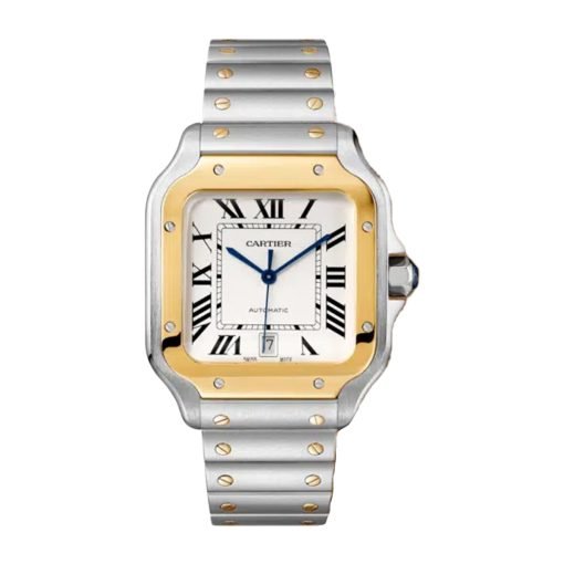 Santos watch, large model, mechanical movement with automatic winding, caliber 1847 MC. Steel case and 18K yellow gold bezel, 7-sided crown set with a faceted synthetic spinel, silvered opaline dial, blued-steel sword-shaped hands, sapphire crystal. Steel bracelet with “SmartLink” adjustment system. Second bracelet in calfskin, with steel double adjustable folding buckle. Both bracelets are fitted with the “QuickSwitch” interchangeability system.