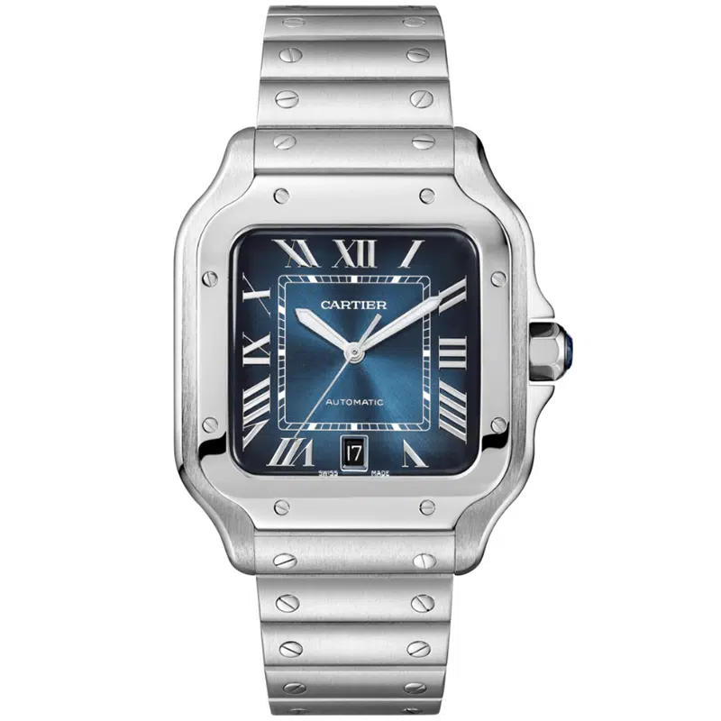 Santos watch, large model, manufacture mechanical movement with automatic winding, caliber 1847 MC. Steel case, 7-sided crown set with a faceted synthetic spinel, graduated blue dial, sword-shaped hands in steel, sapphire crystal.