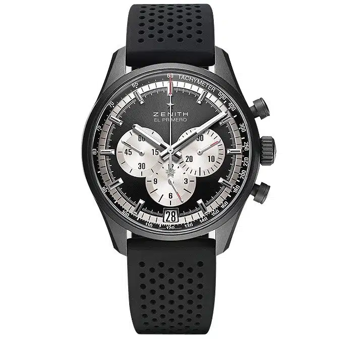Black aluminum case with a black rubber strap. Fixed black aluminum bezel. Black dial with luminous silver-tone hands and index hour markers. Minute markers. Tachymeter markings around the outer rim. Dial Type: Analog. Luminescent hands and markers. Date display at the 6 o’clock position. Chronograph – three silver sub-dials displaying: 60 seconds, 30 minutes and 12 hours. Zenith calibre El Primero 400 automatic movement with a 50-hour power reserve. Scratch resistant sapphire crystal. Pull / push crown.