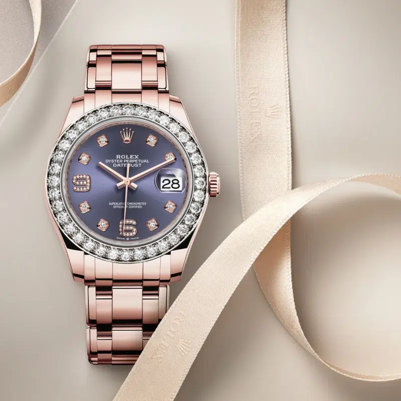 Everose gold—Rolex’s in-house pink gold alloy—combines 18k gold with platinum and copper to ensure enduring hue and corrosion resistance. Exclusive to Rolex since 2005, Everose preserves its warm rose tone over decades, never fading or tarnishing. On the Pearlmaster, Everose sets the ideal canvas for diamond brilliance, creating a symphony of rosy glow and scintillation.