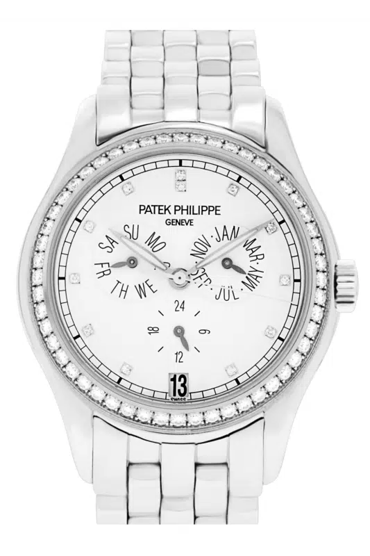 The Patek Philippe 5037/1G Annual Calendar represents the pinnacle of Swiss watchmaking sophistication. This white gold masterpiece features: